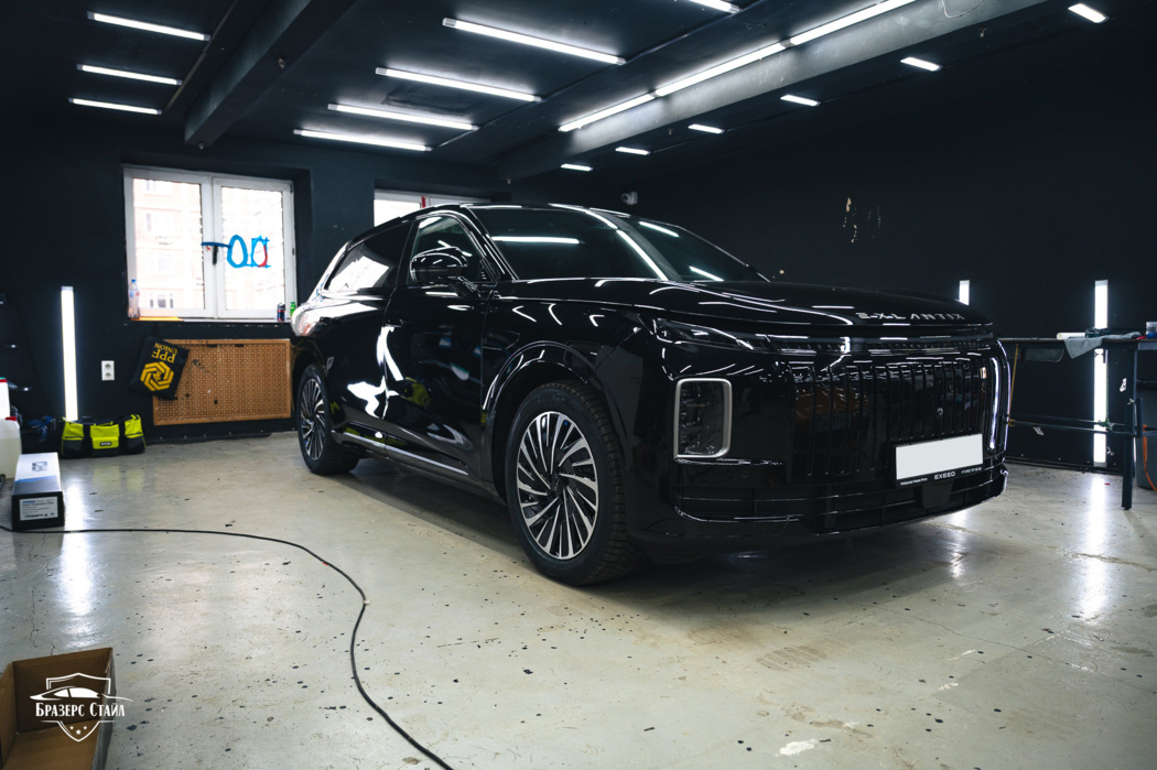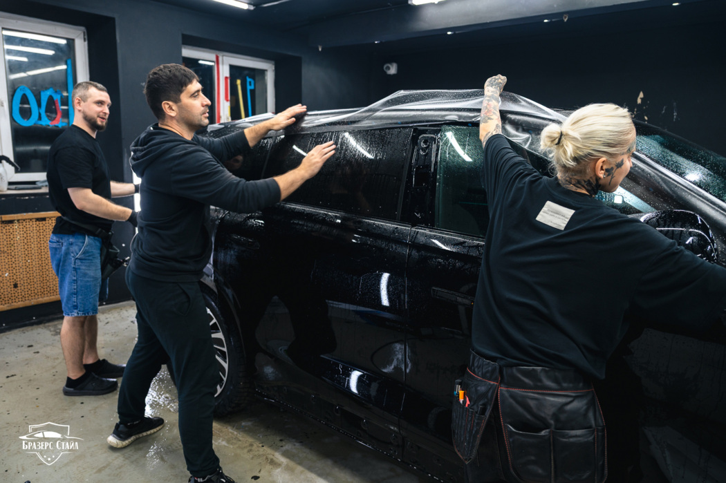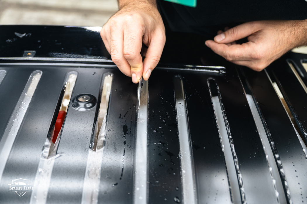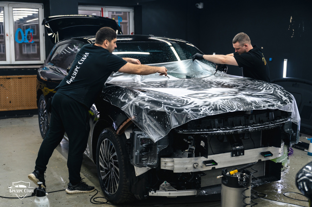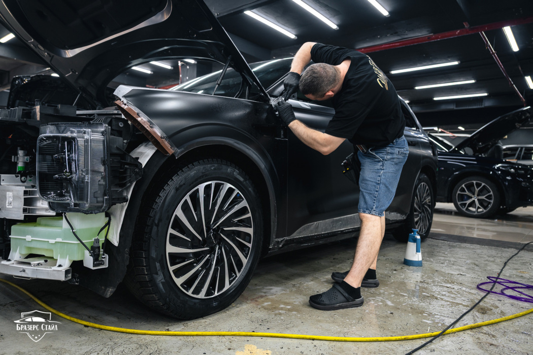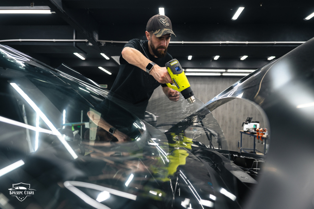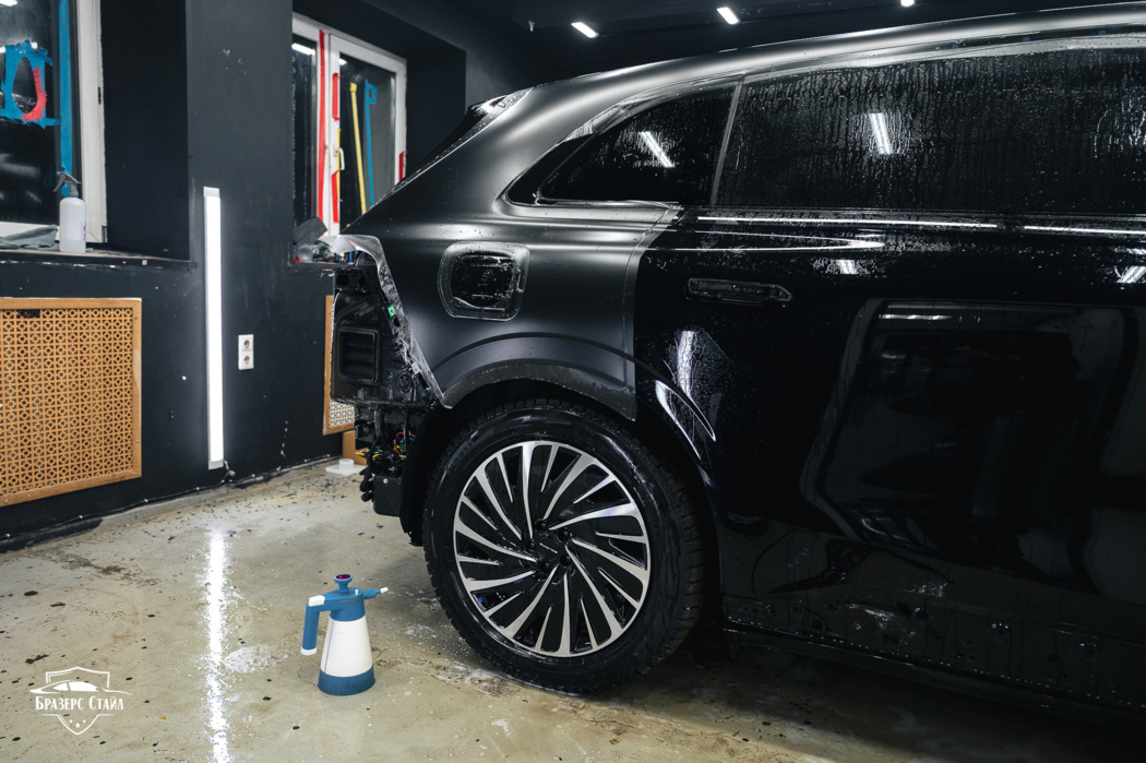 Кроме оклейки кузова Exlantix ET матовым полиуретаном, все глянцевые элементы на кузове мы защитили глянцевым полиуретаном.