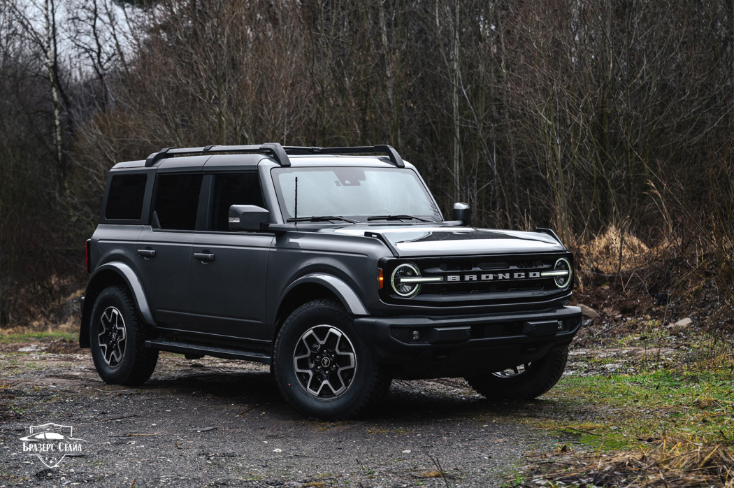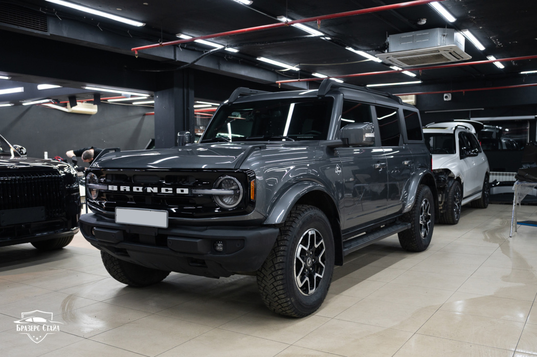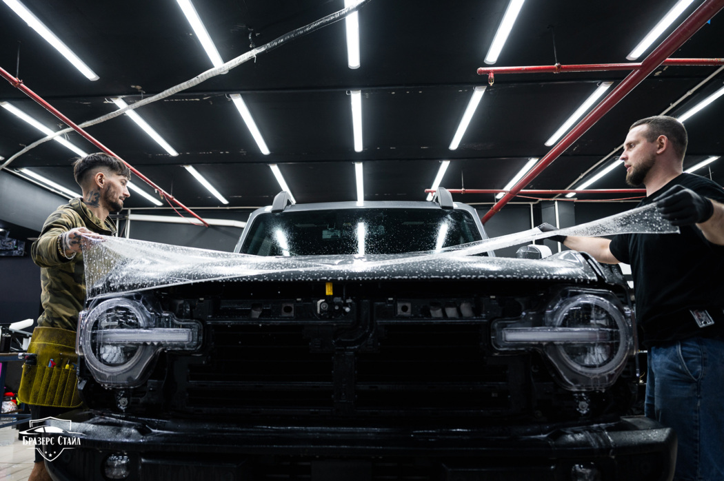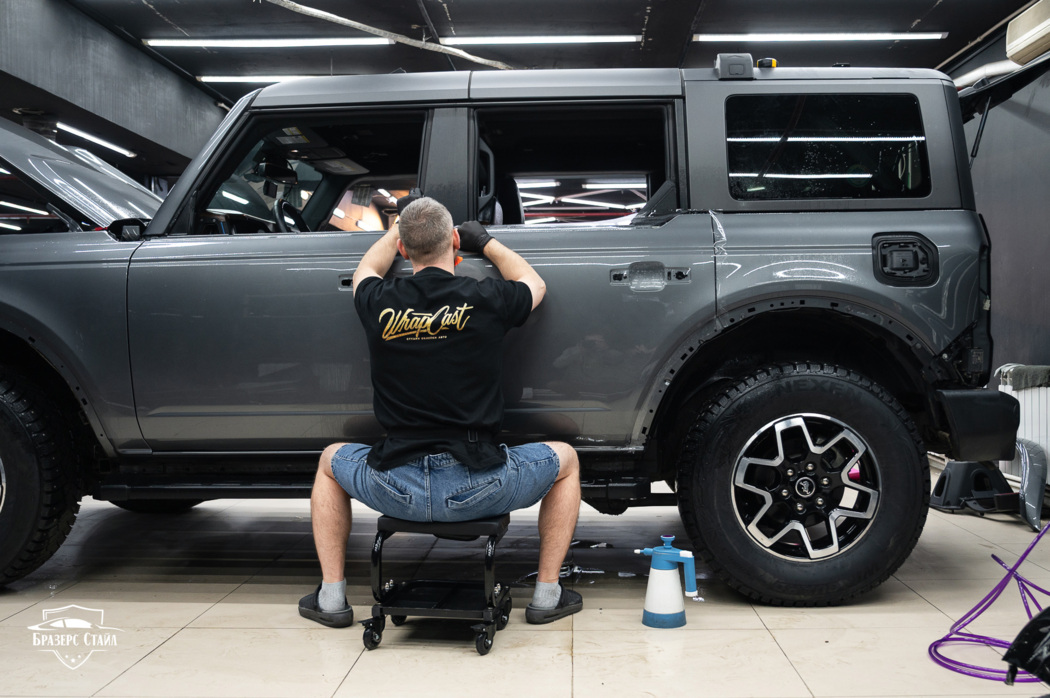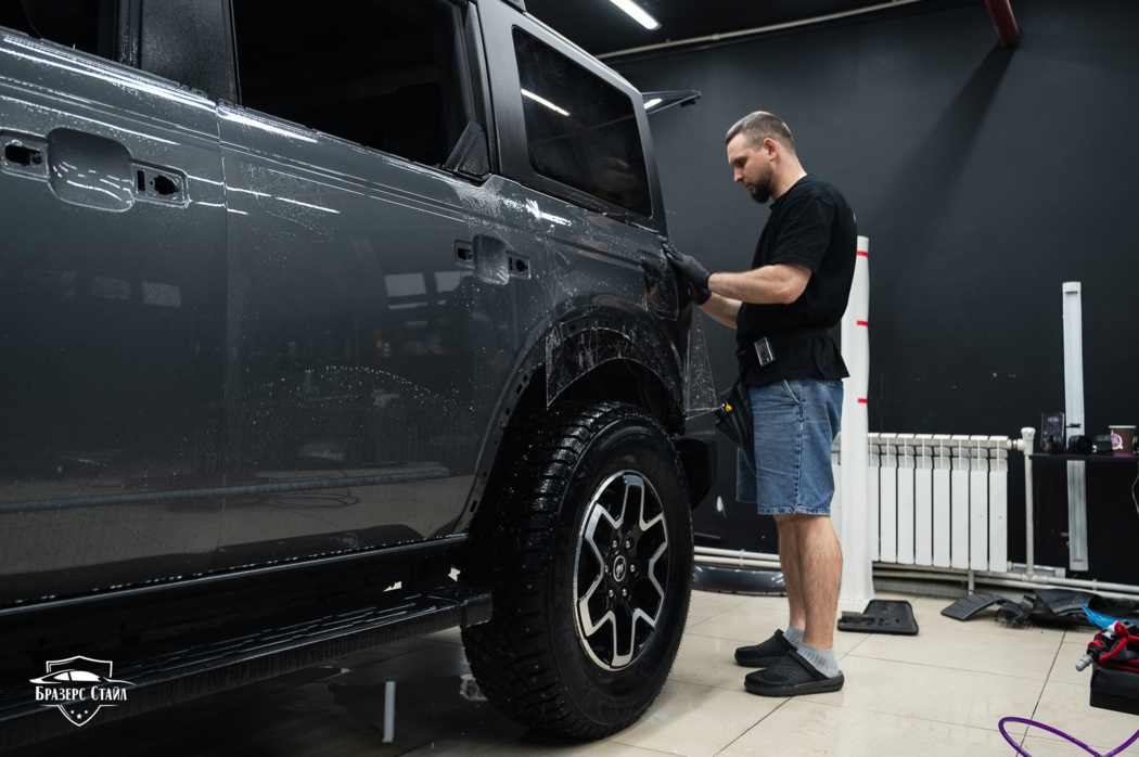 Ford Bronco — большой и брутальный внедорожник с квадратным кузовом. Такой кузов важно своевременно оклеить защитой плёнкой, иначе он очень быстро покроется сколами. Именно за этой услуг приехал к нам клиент.