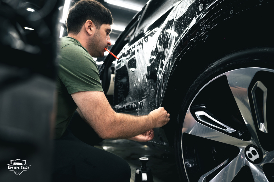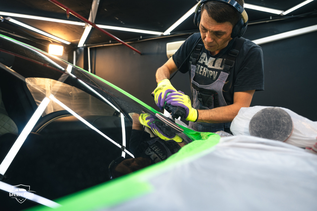 Первое, с чего мы начали, — это детейлинг-мойка кузова автомобиля. Сюда входит мойка кузова шампунем, затем мойка антибитумом, после чего смываем всё шампунем. Затем идёт удаление металлических вкраплений и финальный этап — мойка с шампунем. Затем, внимательно осмотрев состояние ЛКП (автомобиль уже с большим пробегом), мы приступили к наращиванию сколов. После того как все сколы были подкапаны, мы перешли к полировке лобового стекла и ЛКП кузова.