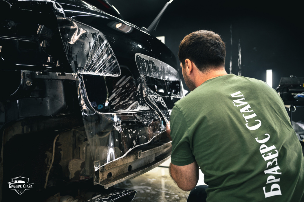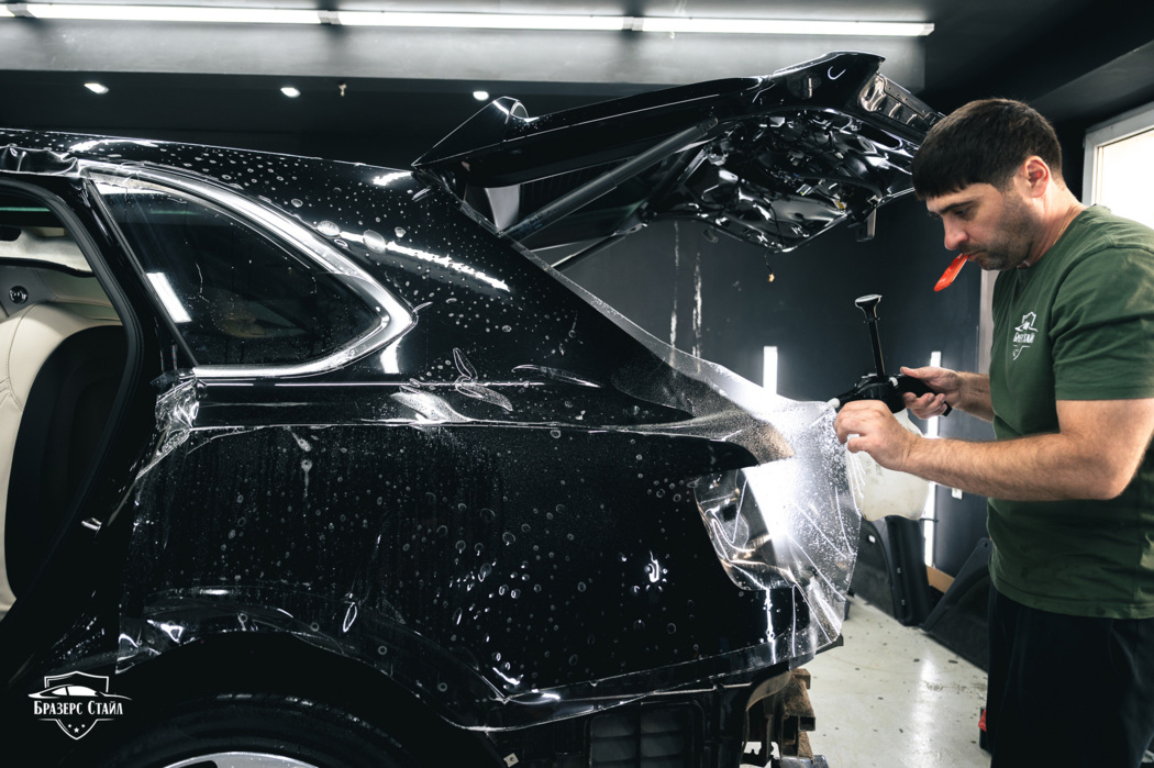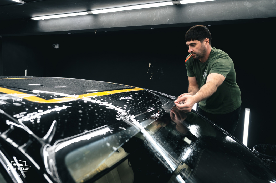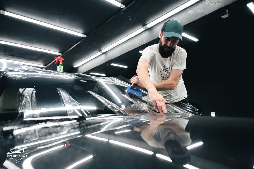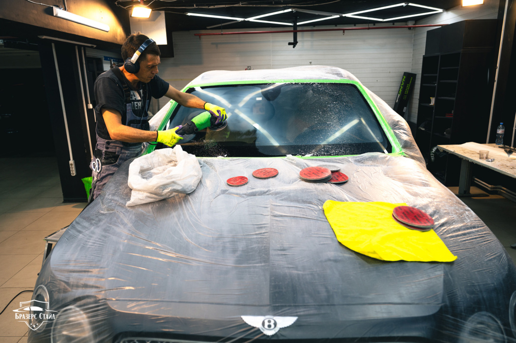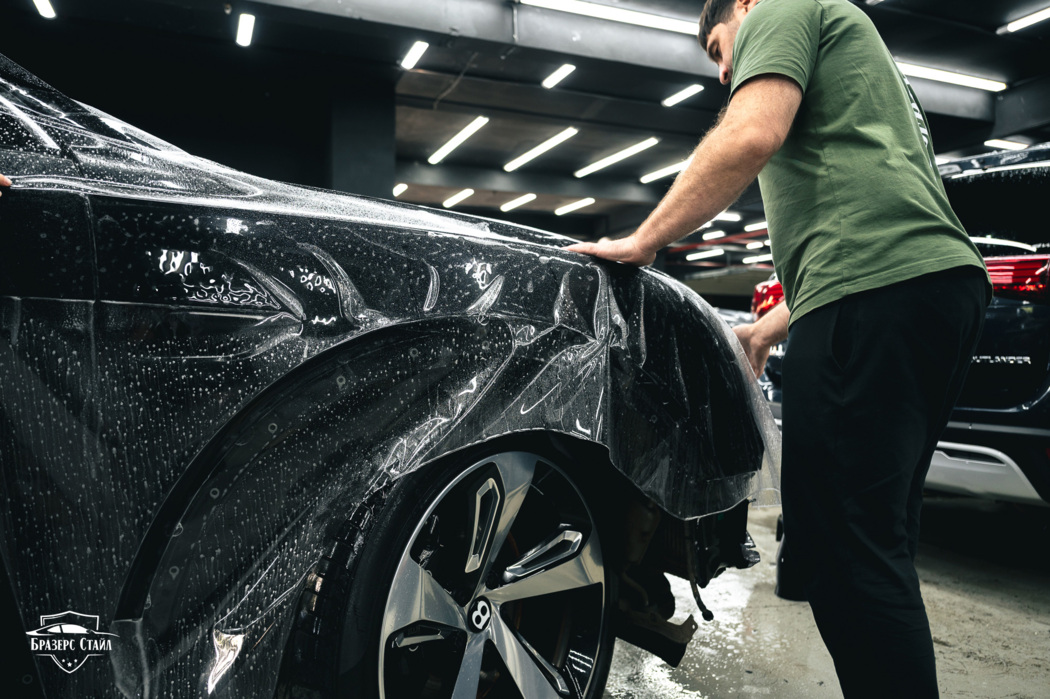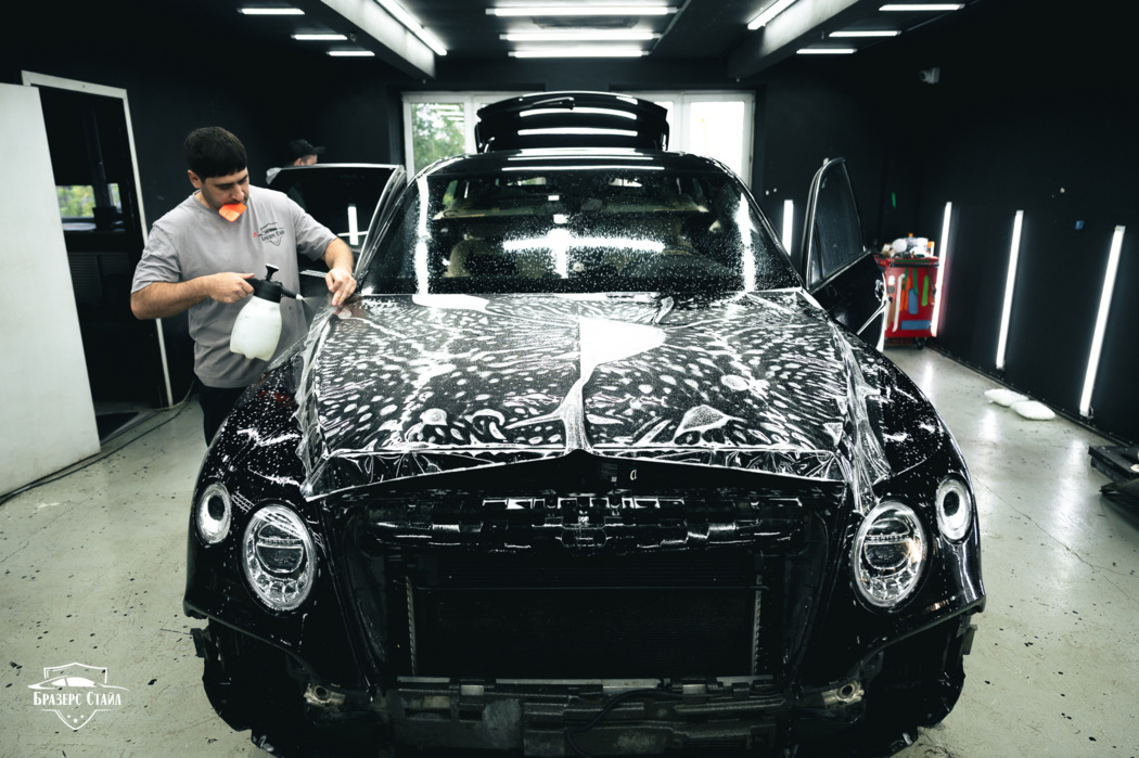 Восстановив внешний вид Bentley Bentayga и приблизив его состояние к новому, мы приступили к следующему шагу — сохранению внешнего вида. Для этого мы использовали глянцевую полиуретановую плёнку. Она возьмёт на себя практически все внешние воздействия, которые обычно приводят к износу лакокрасочного покрытия.