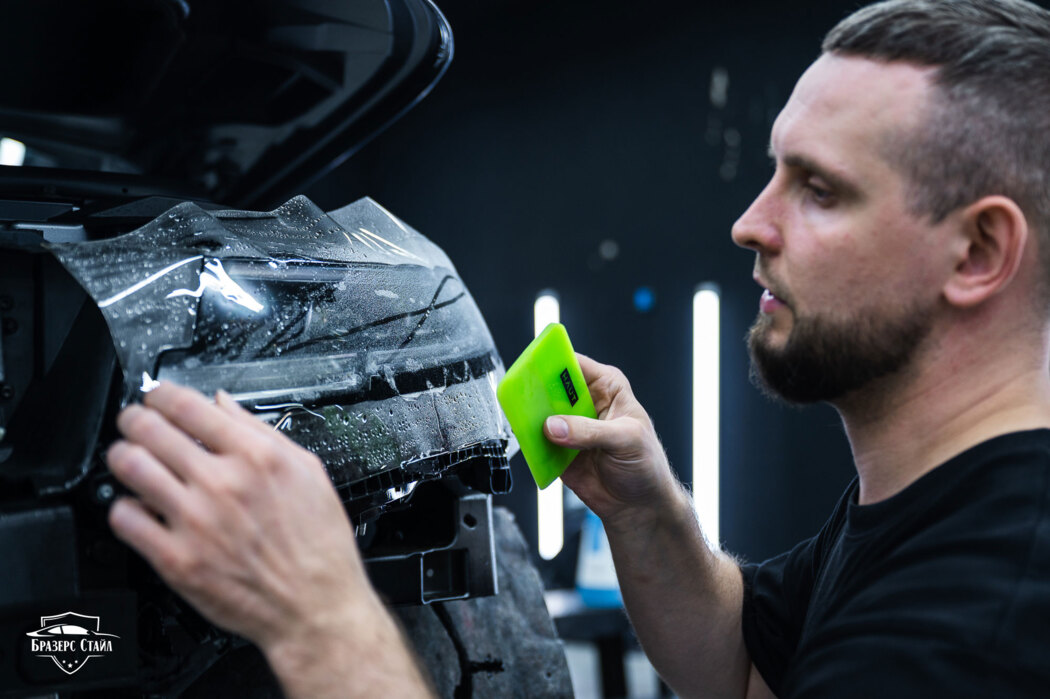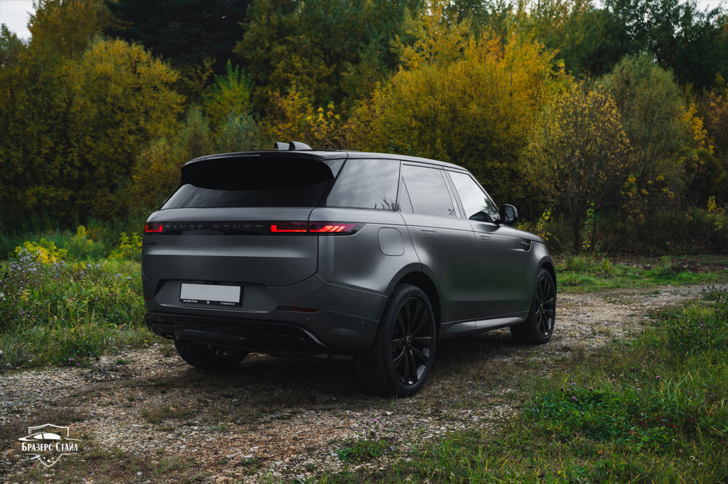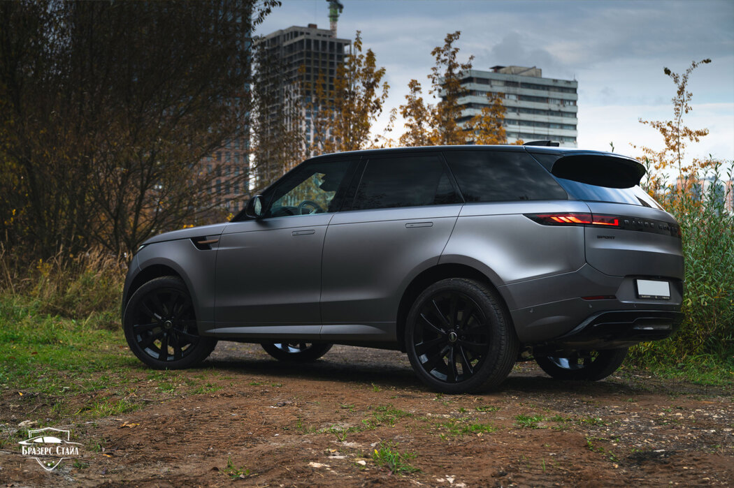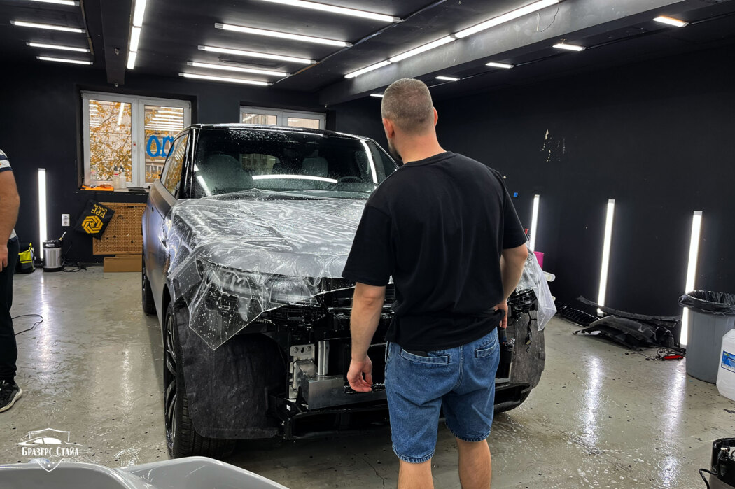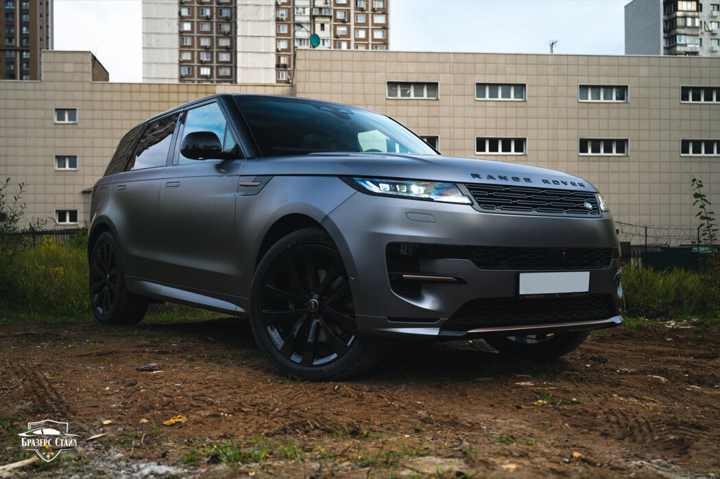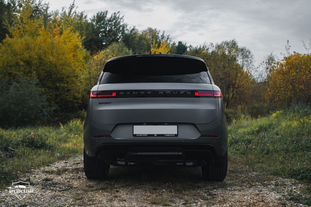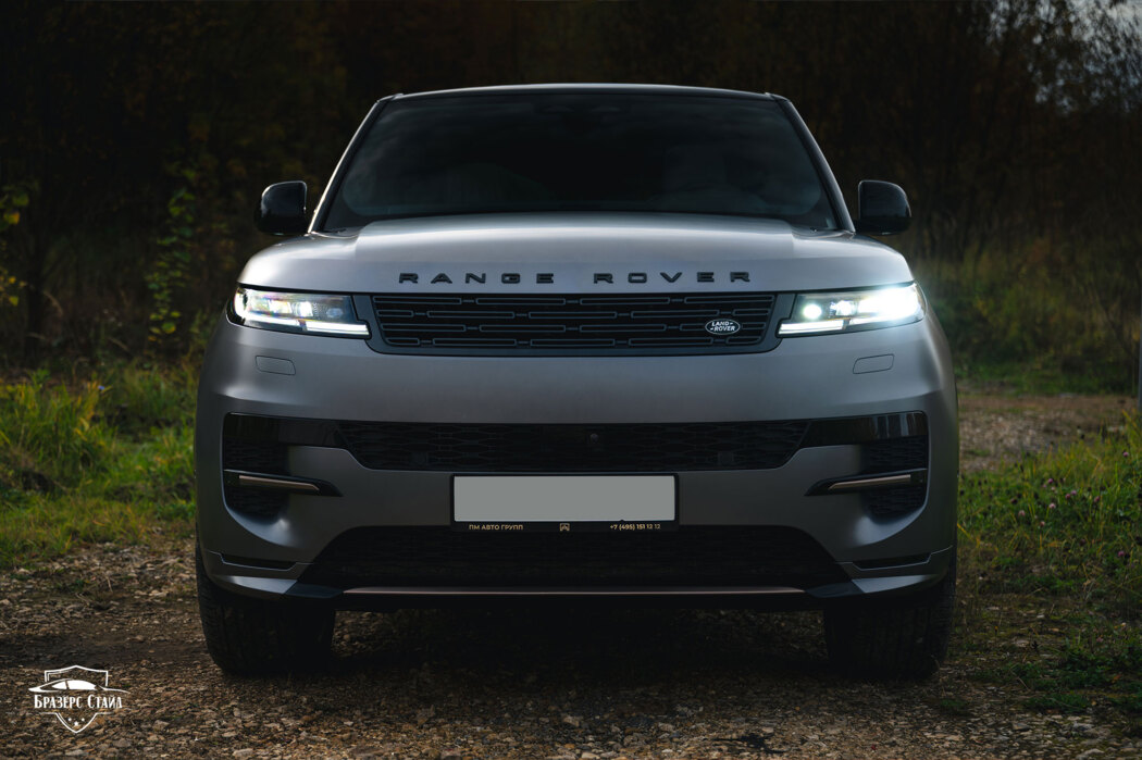 Матовая антигравийная защита кузова Range Rover Sport была не единственной выполненной работой. Все чёрные глянцевые и бронзовые элементы экстерьера мы защитили полиуретаном, включая оптику автомобиля.