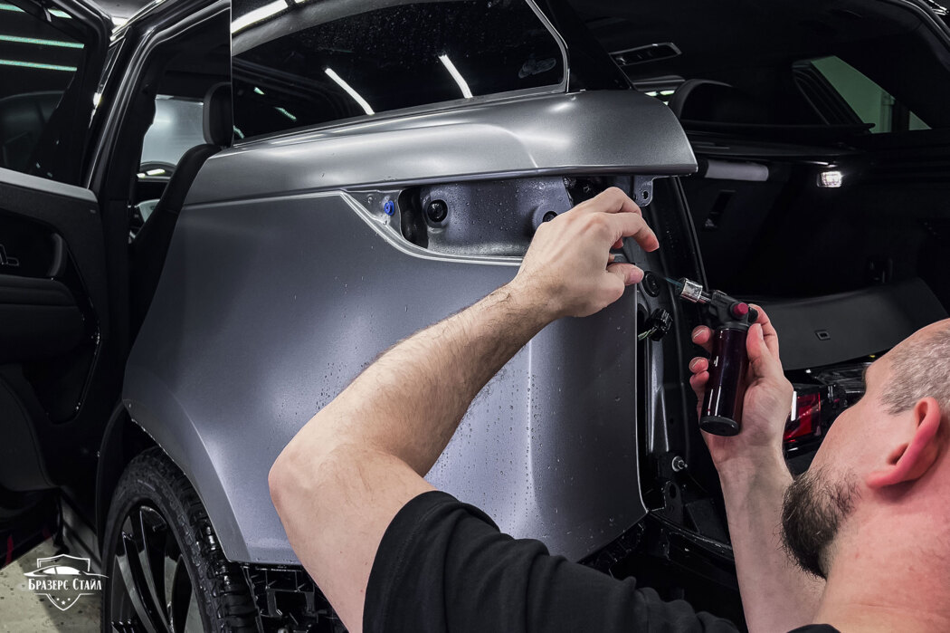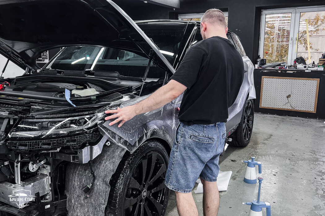 Нам предстояло защитить кузов Range Rover Sport матовым полиуретаном. Наклеив несколько образцов плёнок разных производителей, в итоге выбрали плёнку NAR Satin. Этот материал отлично подошёл по матовости, не сделав кузов более матовым или глянцевым, и не исказил цвет, не сделав его более светлым или, наоборот, тёмным.