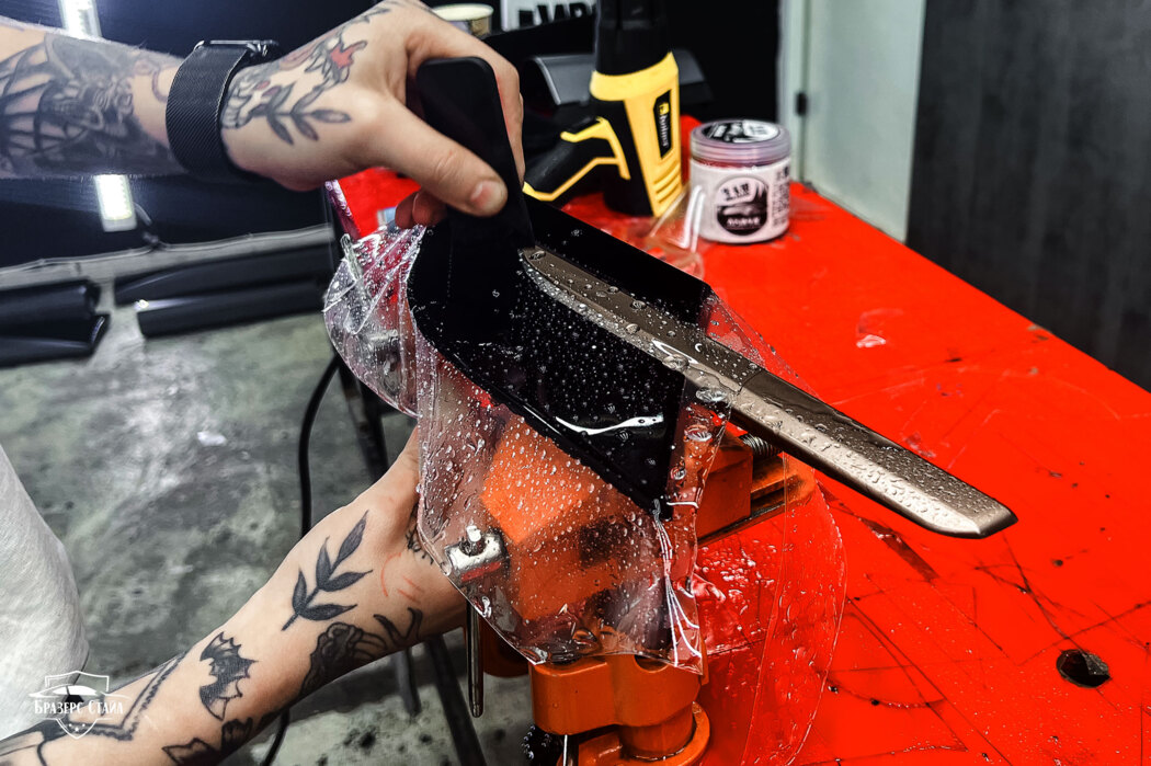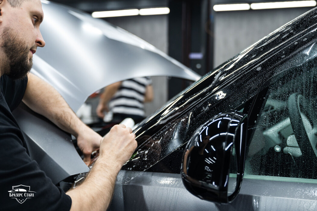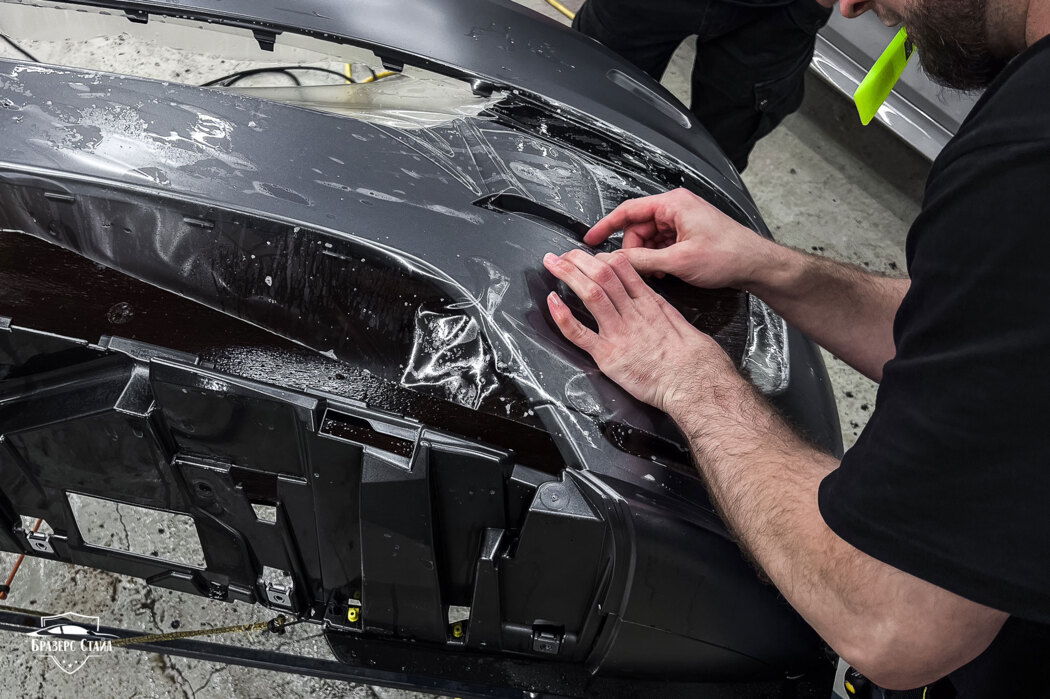 Напомним, что для антигравийной защиты кузова мы использовали материал NAR Premium Satin. Это премиальная полиуретановая плёнка, которая надёжно защищает кузов автомобиля от сколов, царапин, химических реагентов и ультрафиолета и придаёт поверхности элегантный, шелковистый эффект. Если большинство сатиновых плёнок на рынке имеет более жирный отлив, то этот материал по матовости можно сравнить с такими производителями, как Llumar или Legend.