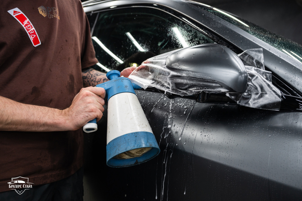 Чёрные элементы отлично гармонируют с матовой плёнкой, создавая стильный и целостный образ, но только пока они блестят и не имеют сколов. Поскольку на автомобиле очень много чёрных глянцевых элементов, было принято решение их тоже защитить глянцевым полиуретаном.