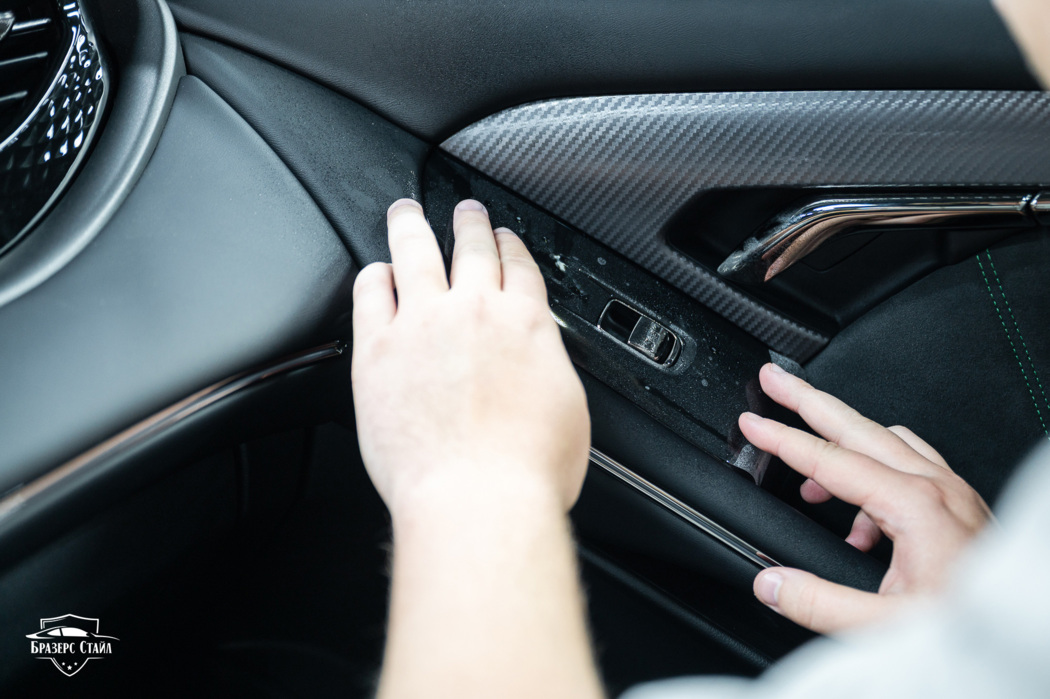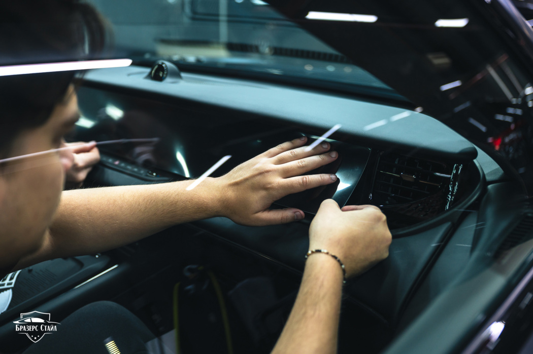 Также износу подвергаются глянцевые элементы салона: сенсорные экраны мультимедийной системы, глянцевые вставки на приборной панели и на дверях авто. Для их защиты мы также используем полиуретановую плёнку. По просьбе владельца мы защитили накладки на дверях глянцевым полиуретаном, а на монитор нанесли матовую плёнку.