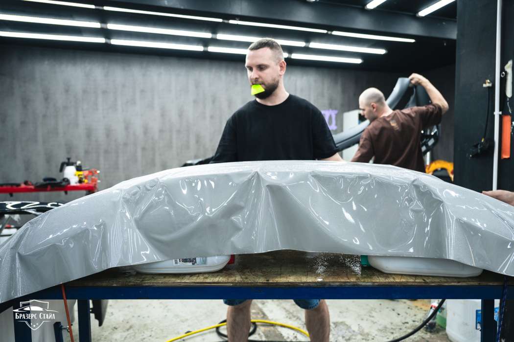 Ещё в 2022 году мы бы поклеили автомобиль ПВХ-плёнкой в цвет, который выбрал владелец, и вторым слоем защитили кузов глянцевой или матовой полиуретановой плёнкой — в зависимости от того, какого эффекта хотел добиться заказчик. Но в 2025 году мы уже можем предложить решение «два в одном» — оклейку кузова цветным полиуретаном.